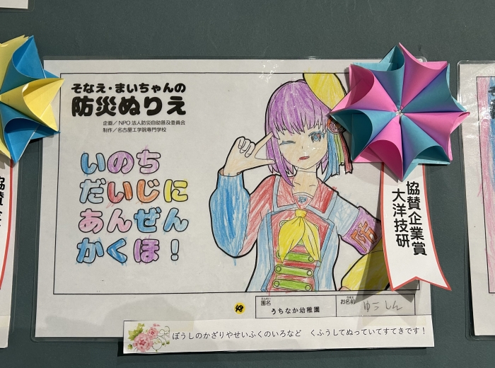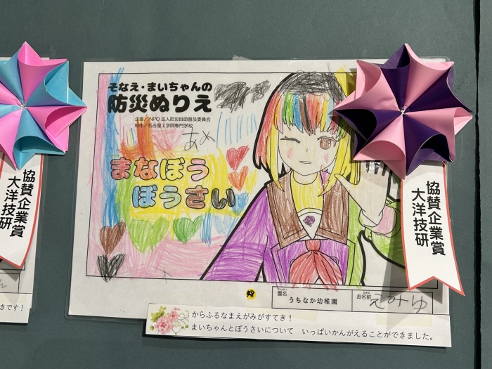 本防災イベントの公式キャラクターの「そないまい」ちゃんのぬり絵大会の表彰式に登壇。